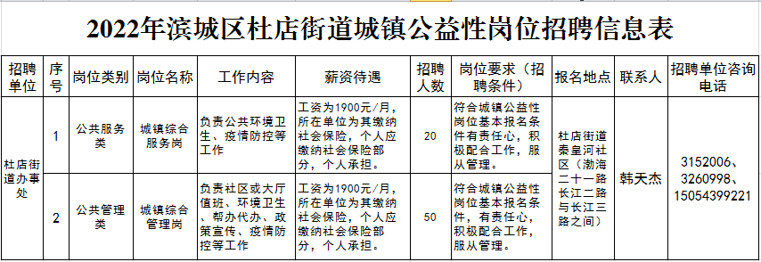 (一)薪酬待遇:補(bǔ)貼標(biāo)準(zhǔn)按照不低于當(dāng)?shù)卦伦畹凸べY標(biāo)準(zhǔn)確定,社會(huì)保險(xiǎn)補(bǔ)貼標(biāo)準(zhǔn)參照用人單位為上崗人員實(shí)際繳納的社會(huì)保險(xiǎn)費(fèi)執(zhí)行(不包含個(gè)人應(yīng)繳納部分)。詳見(jiàn)《2022年濱城區(qū)杜店街道城鎮(zhèn)公益性崗位招聘信息表》。