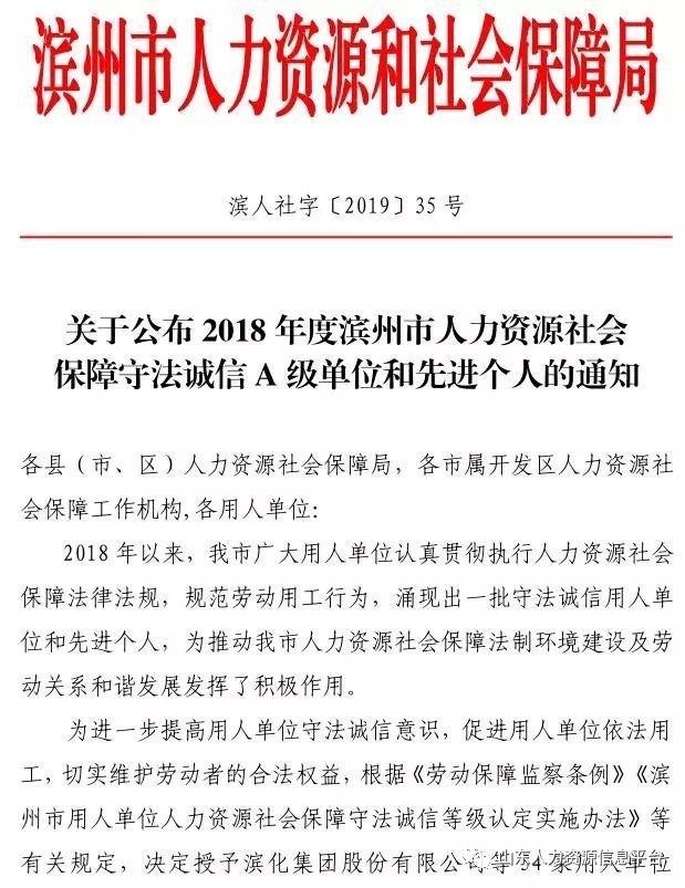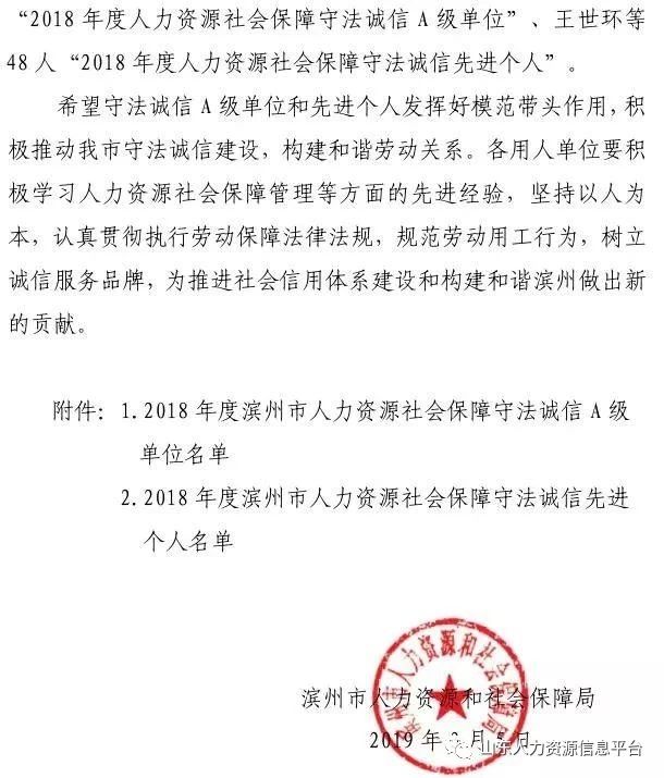 近日,濱州市人力資源和社會(huì)保障局對(duì)“2018年度人力資源社會(huì)保障守法誠信A級(jí)單位”進(jìn)行了綜合評(píng)定,濱州益謙人力資源管理有限公司等54家用人單位榜上有名,王世環(huán)等48人被評(píng)定為“2018年度人力資源社會(huì)保障守法誠信先進(jìn)個(gè)人”。
